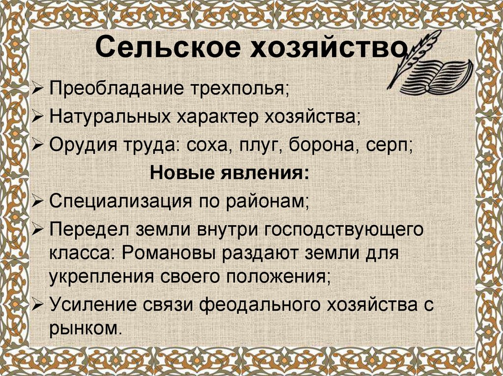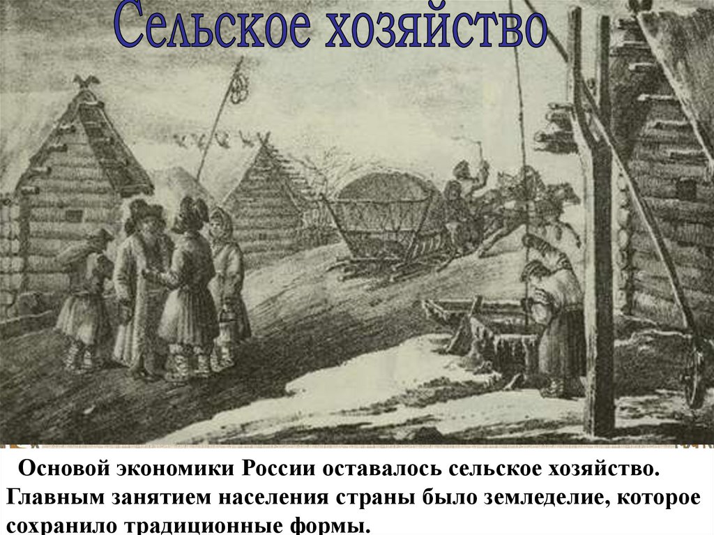 Основой экономики России оставалось сельское хозяйство.Главным занятием населения страны было земледелие, которое