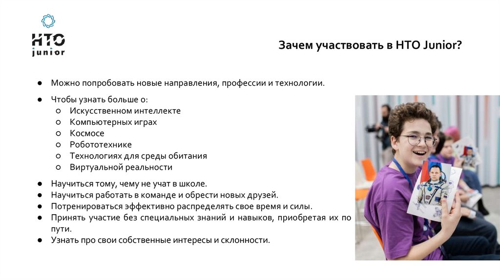 Зачем участвовать в НТО Junior?● Можно попробовать новые направления, профессии и технологии.