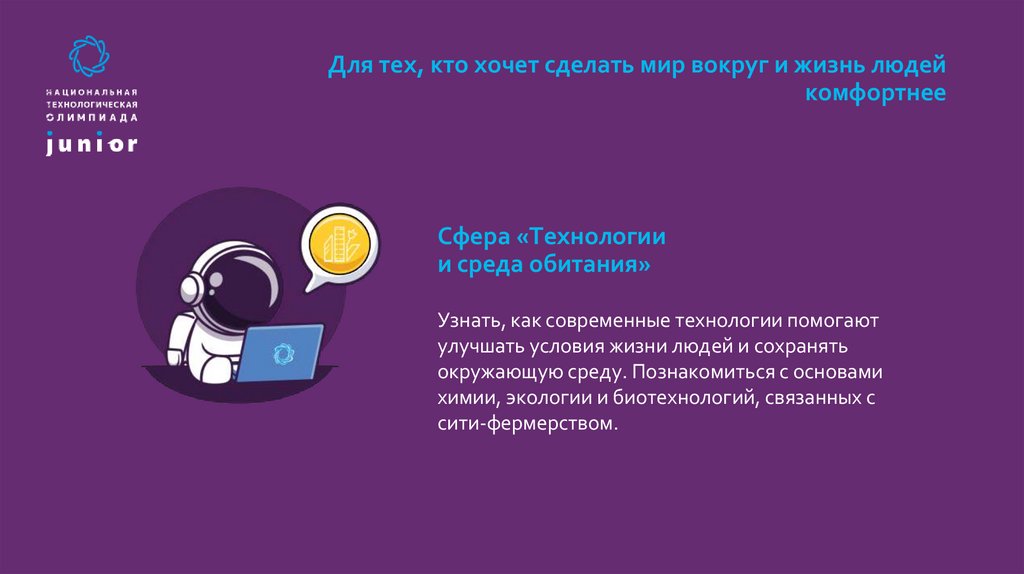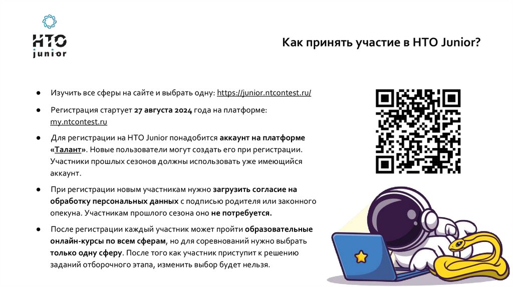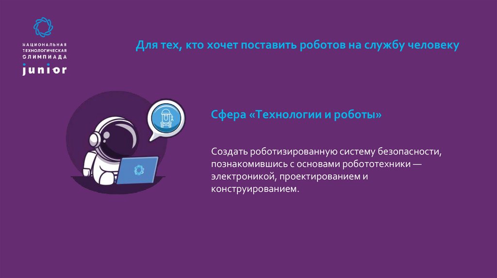 Как принять участие в НТО Junior?Изучить все сферы на сайте и выбрать одну: https://junior.ntcontest.ru/