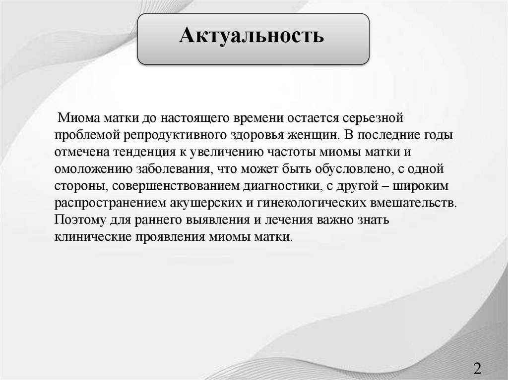 АктуальностьМиома матки до настоящего времени остается серьезной