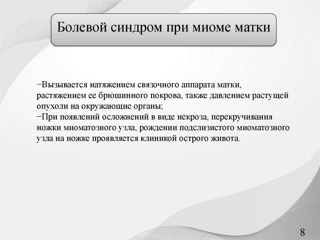 Болевой синдром при миоме матки−Вызывается натяжением связочного аппарата матки,