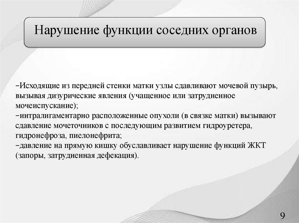 Нарушение функции соседних органов−Исходящие из передней стенки матки узлы сдавливают мочевой пузырь,