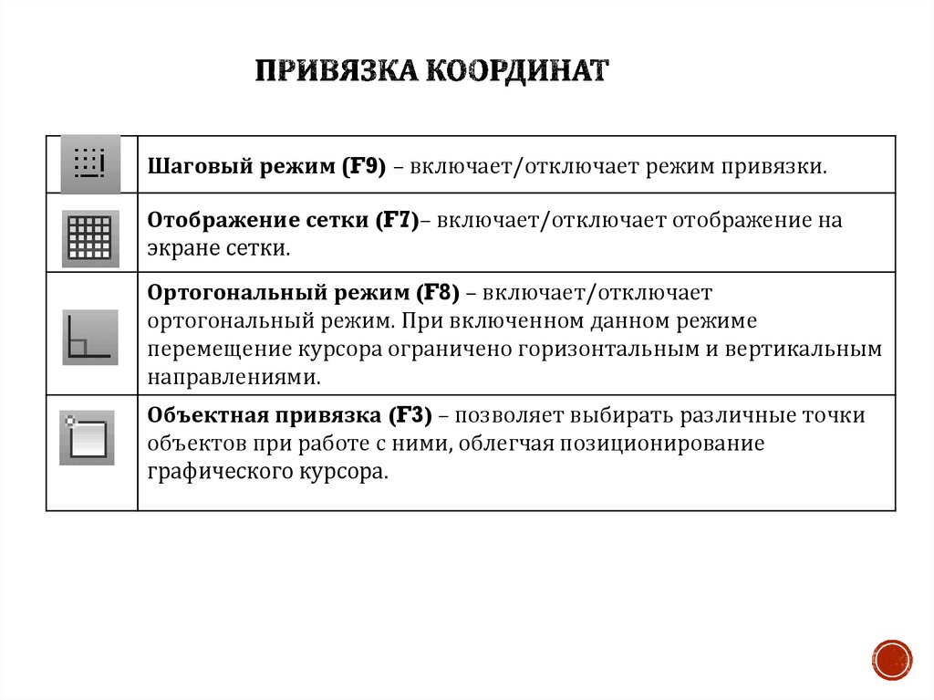 Шаговый режим (F9) – включает/отключает режим привязки.Отображение сетки (F7)– включает/отключает отображение на