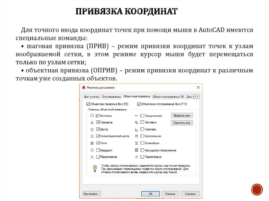 Для точного ввода координат точек при помощи мыши в AutoCAD имеютсяспециальные команды: