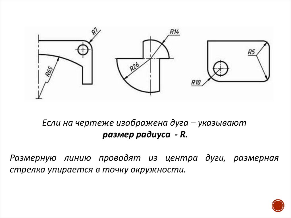 Если на чертеже изображена дуга – указываютразмер радиуса - R.