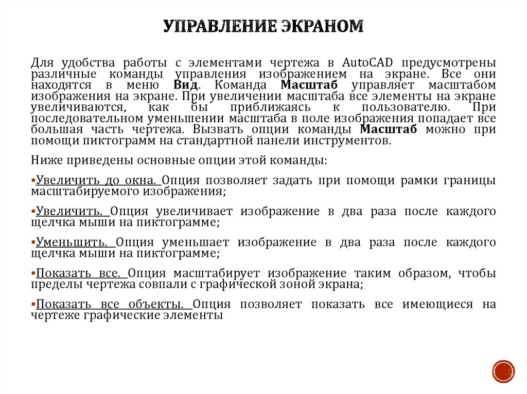 Для удобства работы с элементами чертежа в AutoCAD предусмотреныразличные команды управления изображением на экране. Все они