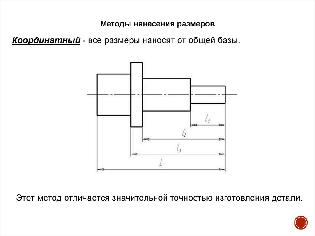 Методы нанесения размеровКоординатный - все размеры наносят от общей базы.