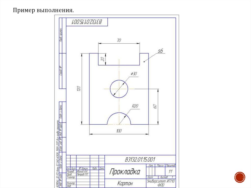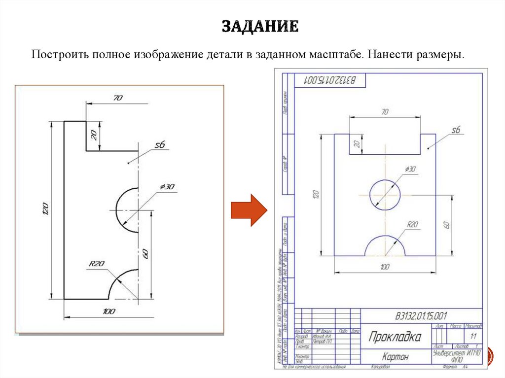 Построить полное изображение детали в заданном масштабе. Нанести размеры.39. Пример выполнения задания