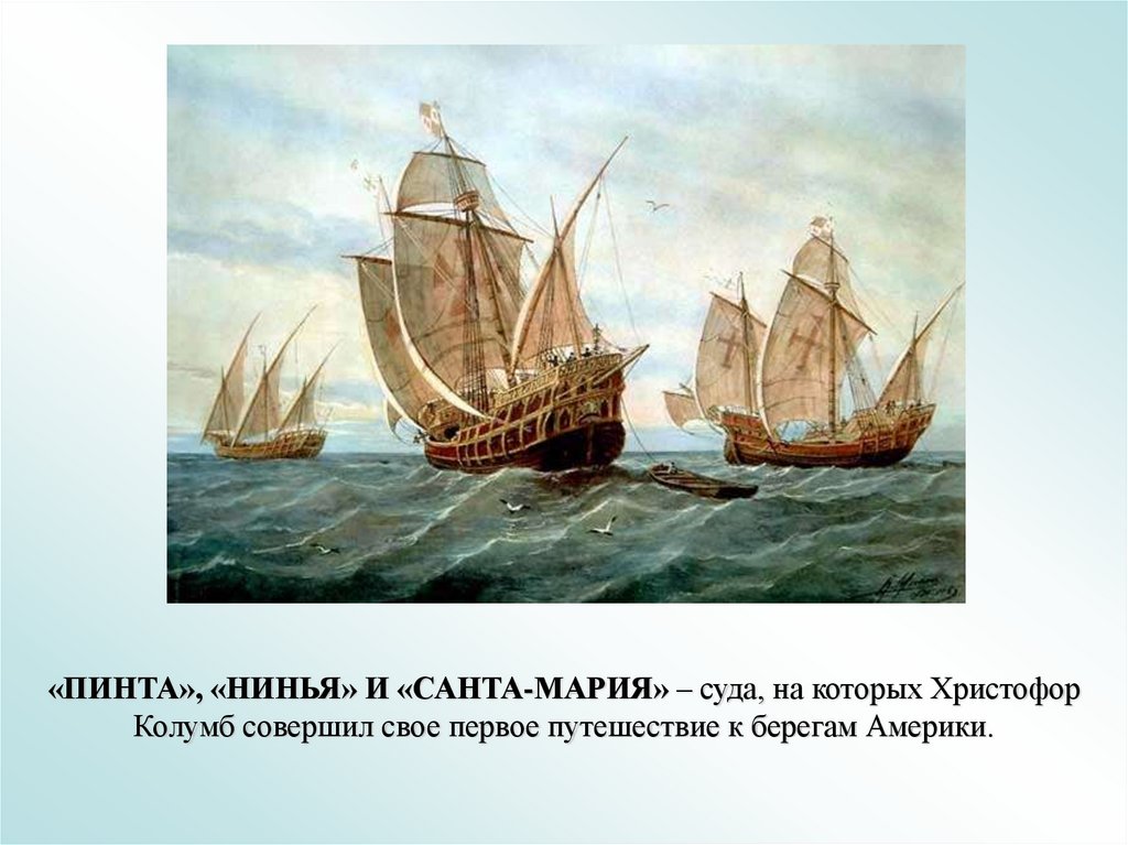«ПИНТА», «НИНЬЯ» И «САНТА-МАРИЯ» – суда, на которых ХристофорКолумб совершил свое первое путешествие к берегам Америки.