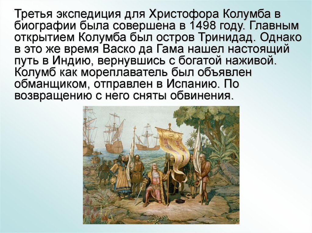 Третья экспедиция для Христофора Колумба вбиографии была совершена в 1498 году. Главным