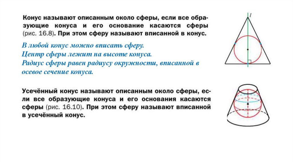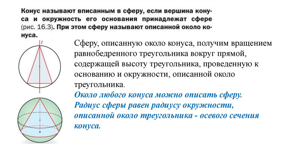 Сферу, описанную около конуса, получим вращениемравнобедренного треугольника вокруг прямой,