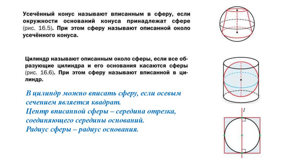 В цилиндр можно вписать сферу, если осевымсечением является квадрат.