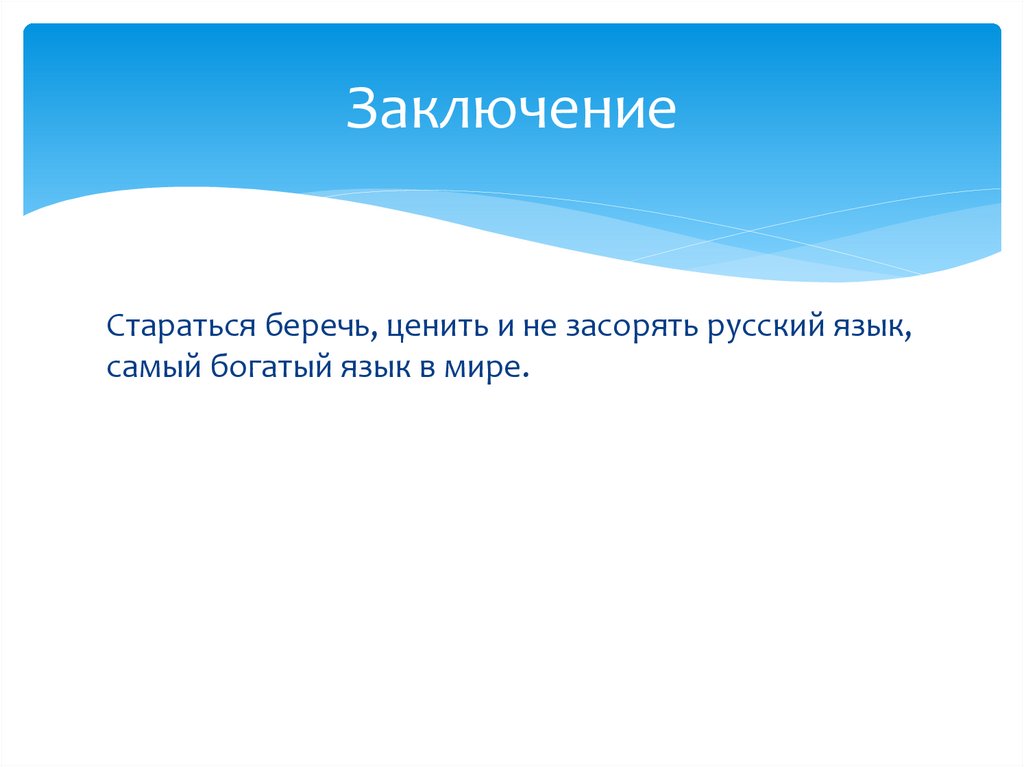 ЗаключениеСтараться беречь, ценить и не засорять русский язык,