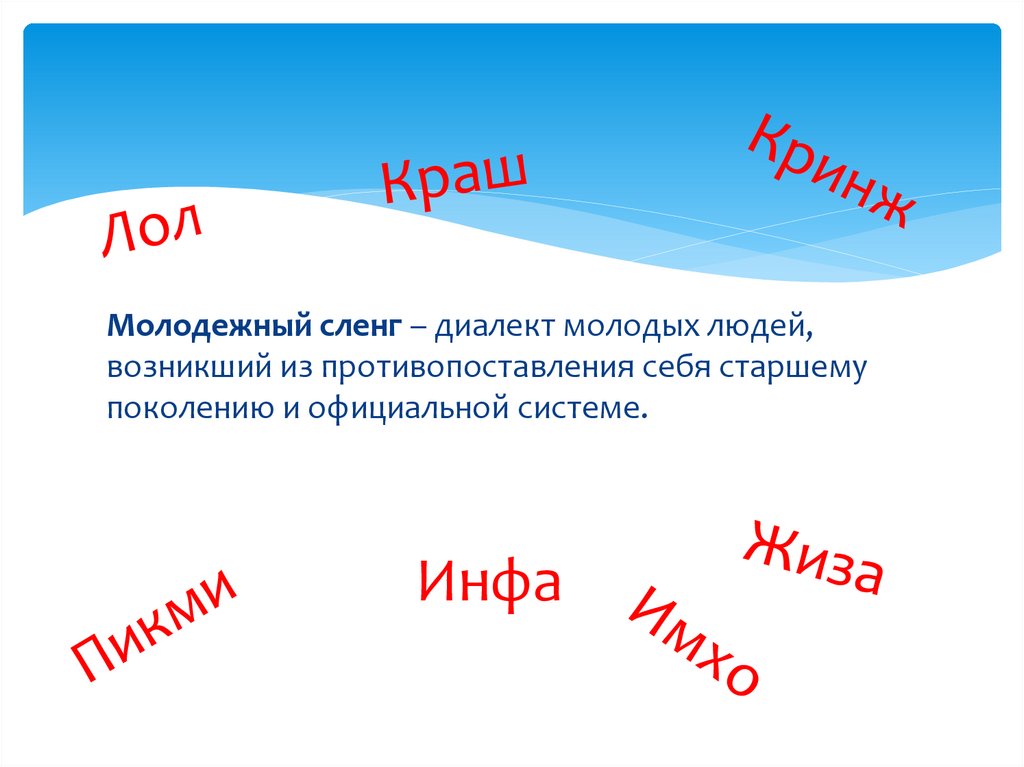 Молодежный сленг – диалект молодых людей,возникший из противопоставления себя старшему