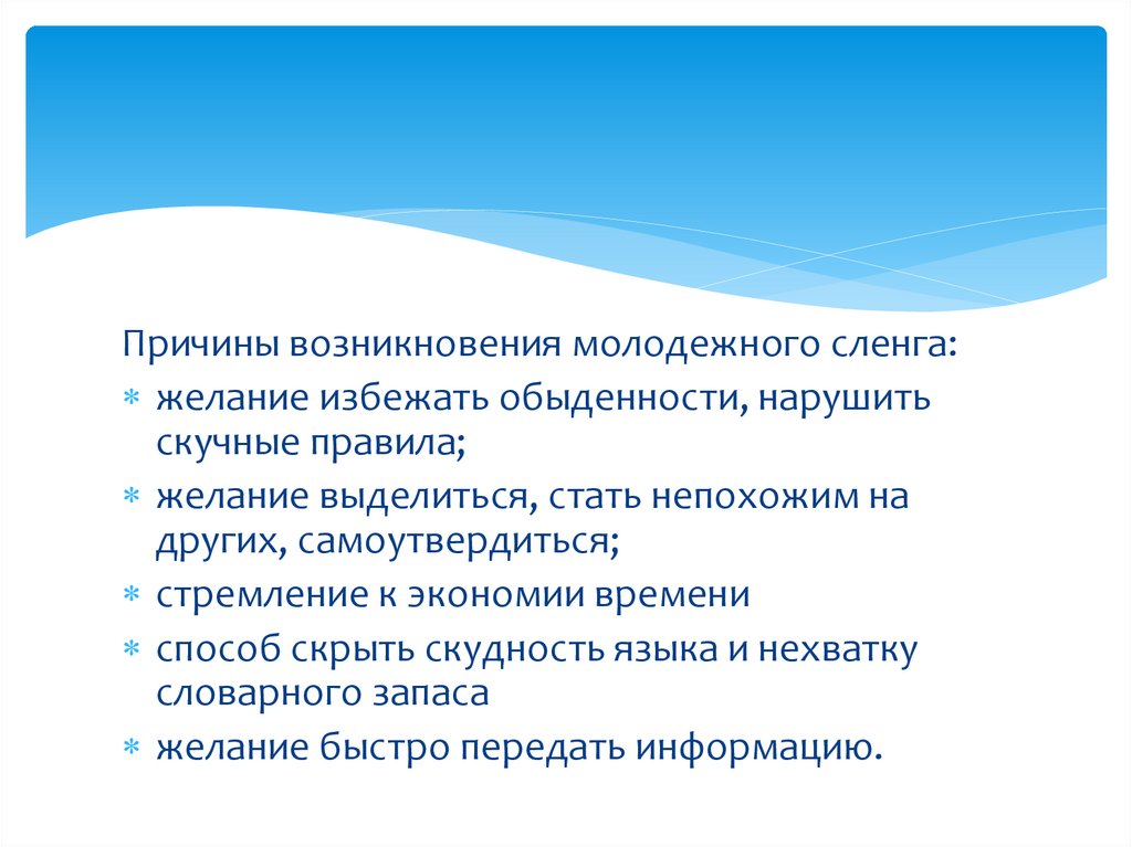 Причины возникновения молодежного сленга:желание избежать обыденности, нарушить
