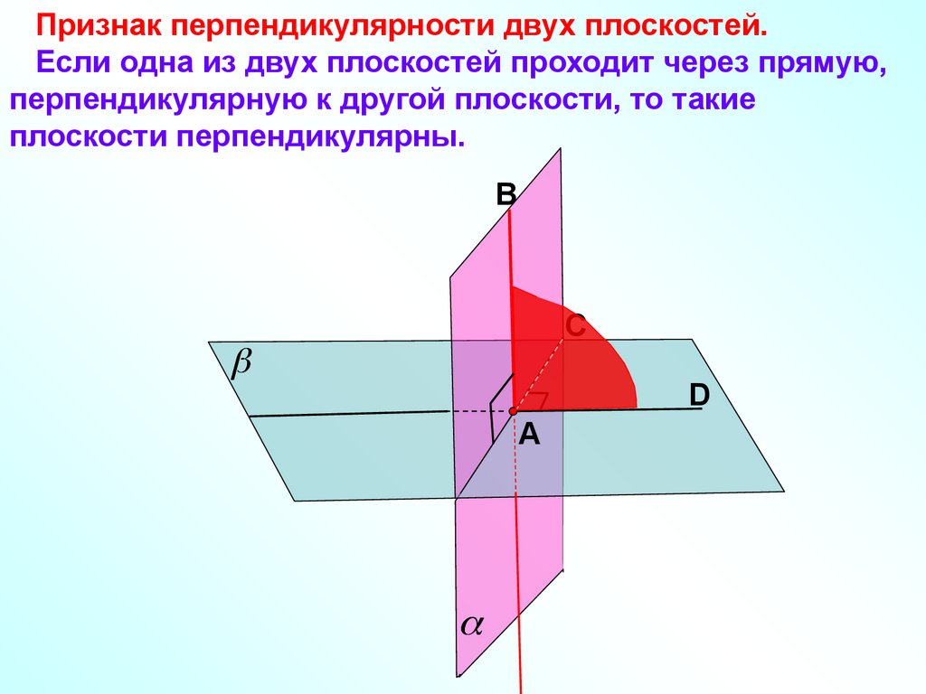 Признак перпендикулярности двух плоскостей.Если одна из двух плоскостей проходит через прямую,