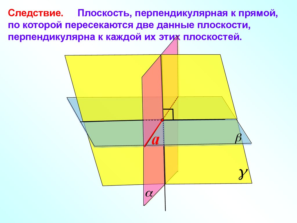 Следствие. Плоскость, перпендикулярная к прямой,по которой пересекаются две данные плоскости,