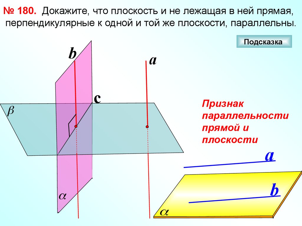№ 180. Докажите, что плоскость и не лежащая в ней прямая,перпендикулярные к одной и той же плоскости, параллельны.