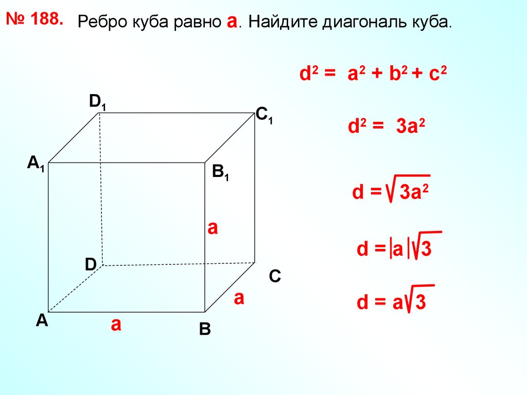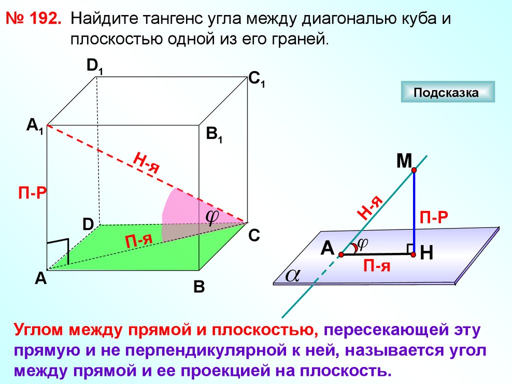№ 192. Найдите тангенс угла между диагональю куба иплоскостью одной из его граней.