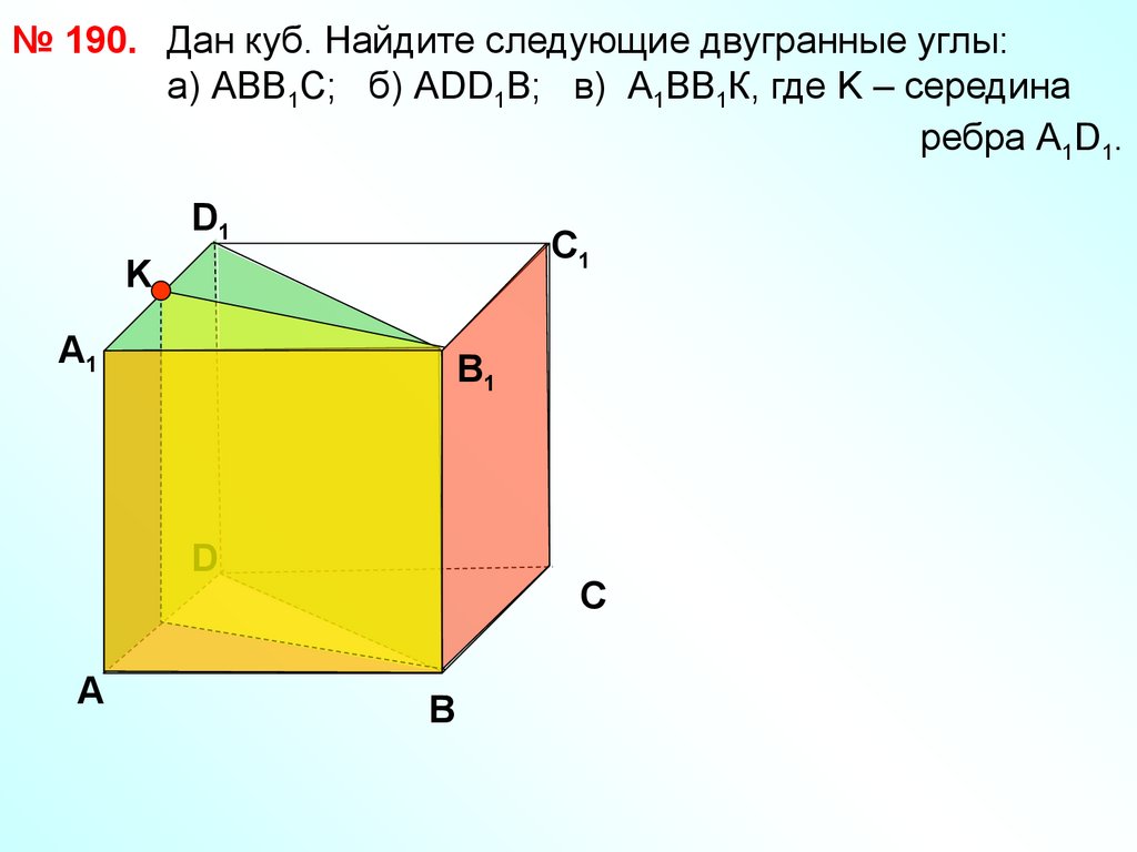 № 190. Дан куб. Найдите следующие двугранные углы:a) АВВ1С; б) АDD1B; в) А1ВВ1К, где K – середина