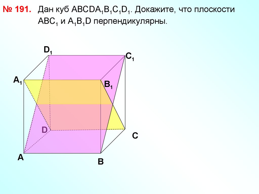 № 191. Дан куб АВСDА1В1С1D1. Докажите, что плоскостиАВС1 и А1В1D перпендикулярны.