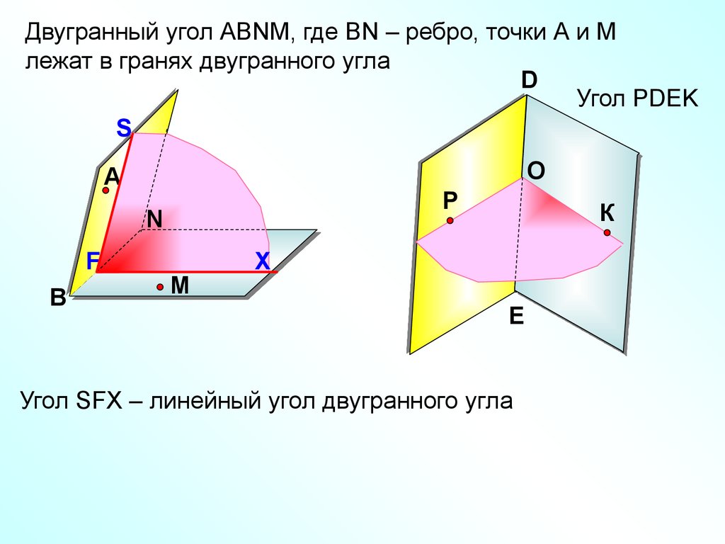 Двугранный угол АВNМ, где ВN – ребро, точки А и Млежат в гранях двугранного угла
