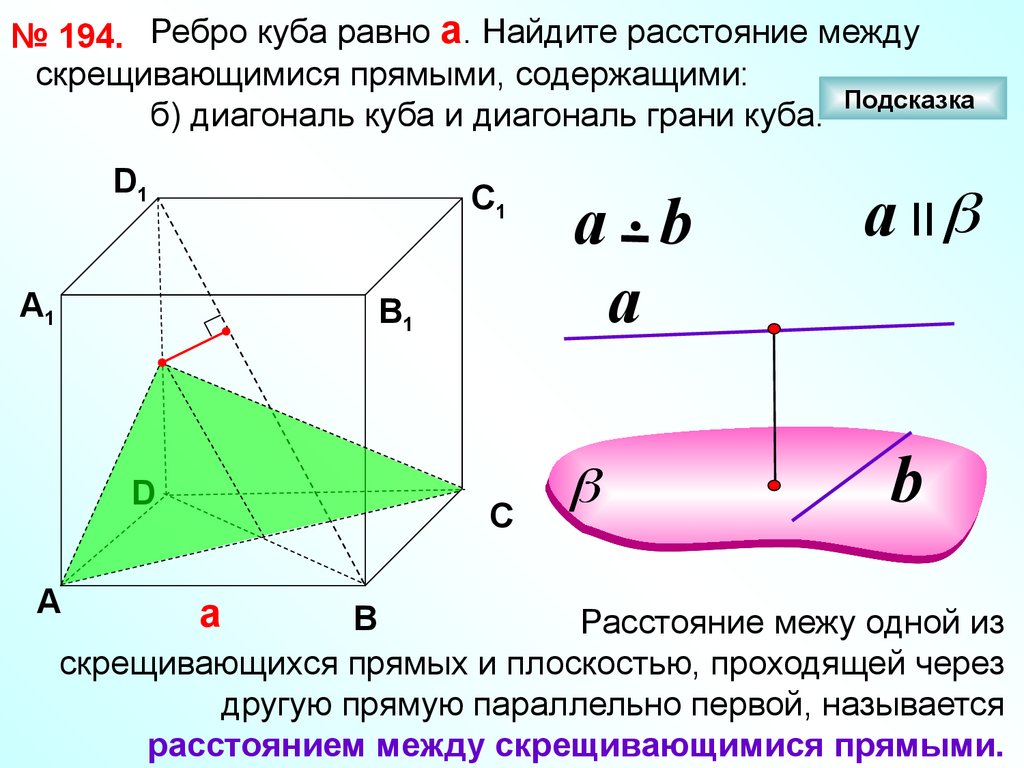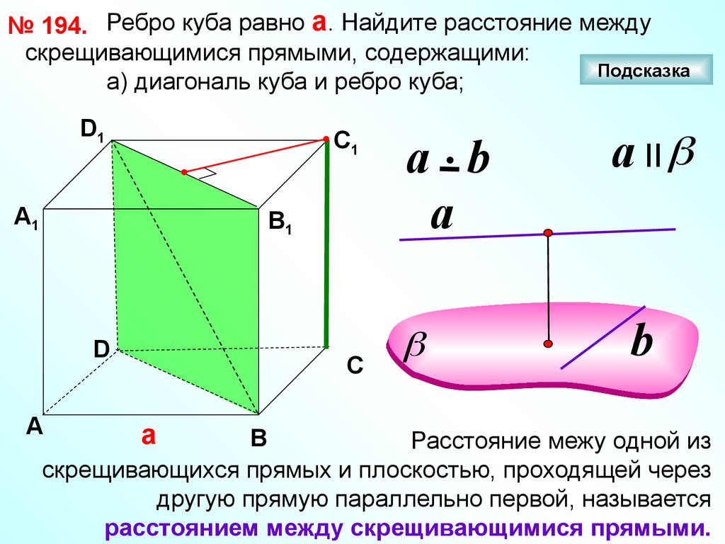 № 194. Ребро куба равно а. Найдите расстояние междускрещивающимися прямыми, содержащими: