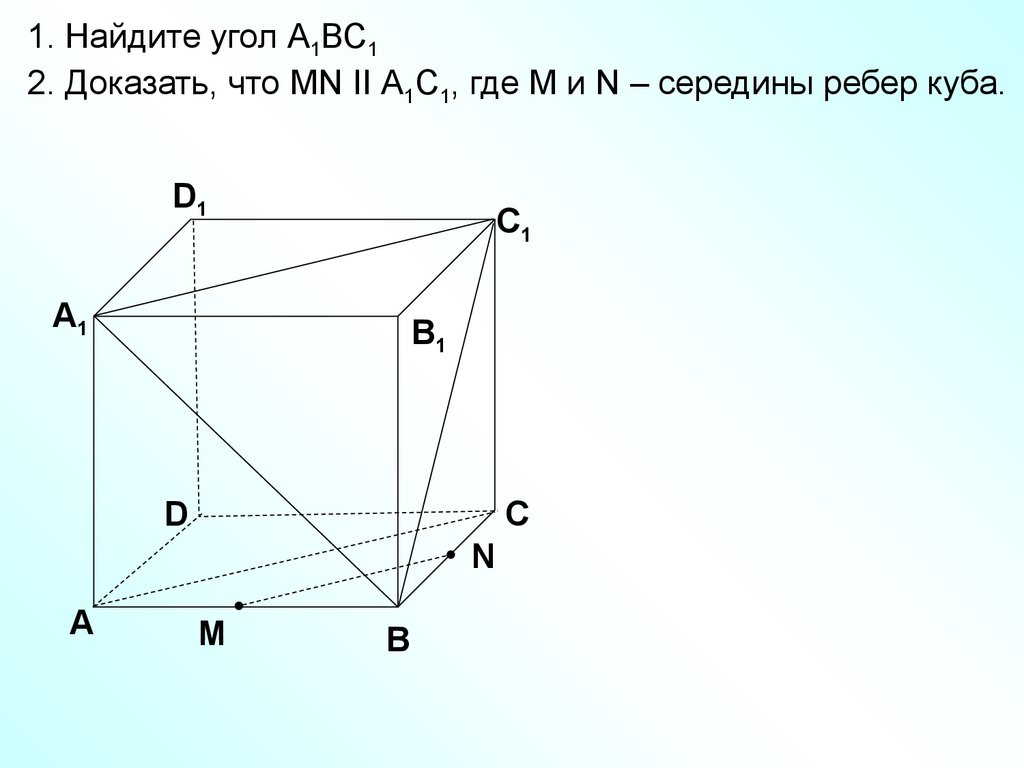 1. Найдите угол А1ВС12. Доказать, что MN II А1С1, где M и N – середины ребер куба.