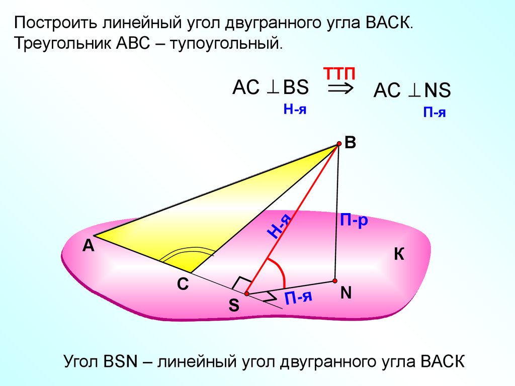Построить линейный угол двугранного угла ВАСК.Треугольник АВС – тупоугольный.