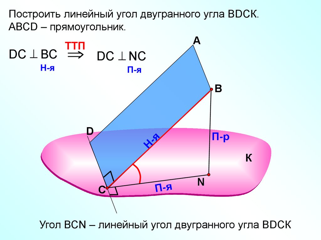 Построить линейный угол двугранного угла ВDСК.АВСD – прямоугольник.