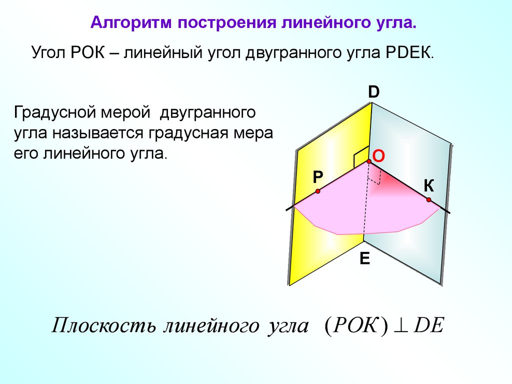 Алгоритм построения линейного угла.Угол РОК – линейный угол двугранного угла РDEК.