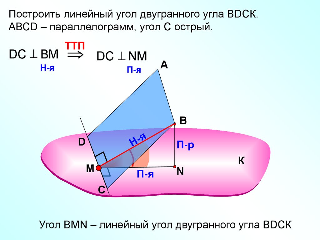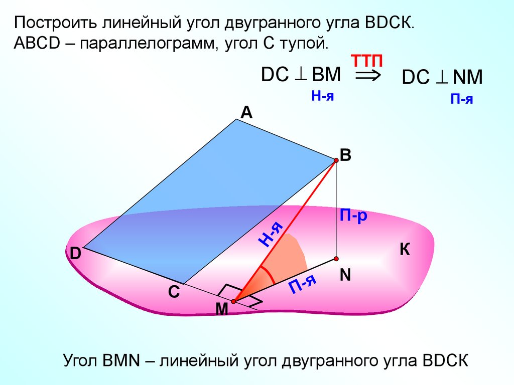 Построить линейный угол двугранного угла ВDСК.АВСD – параллелограмм, угол С тупой.