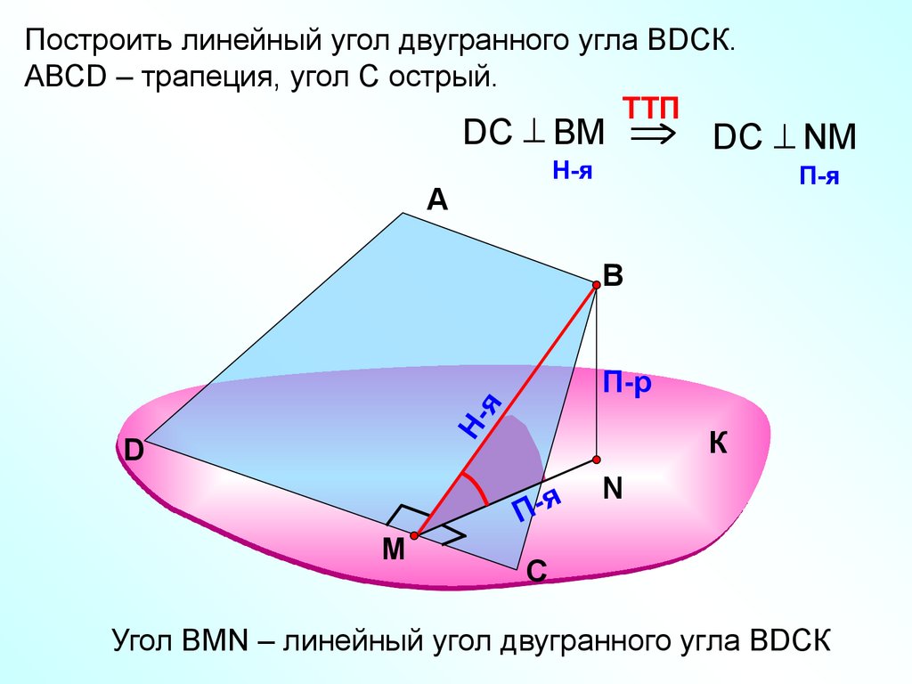 Построить линейный угол двугранного угла ВDСК.АВСD – трапеция, угол С острый.