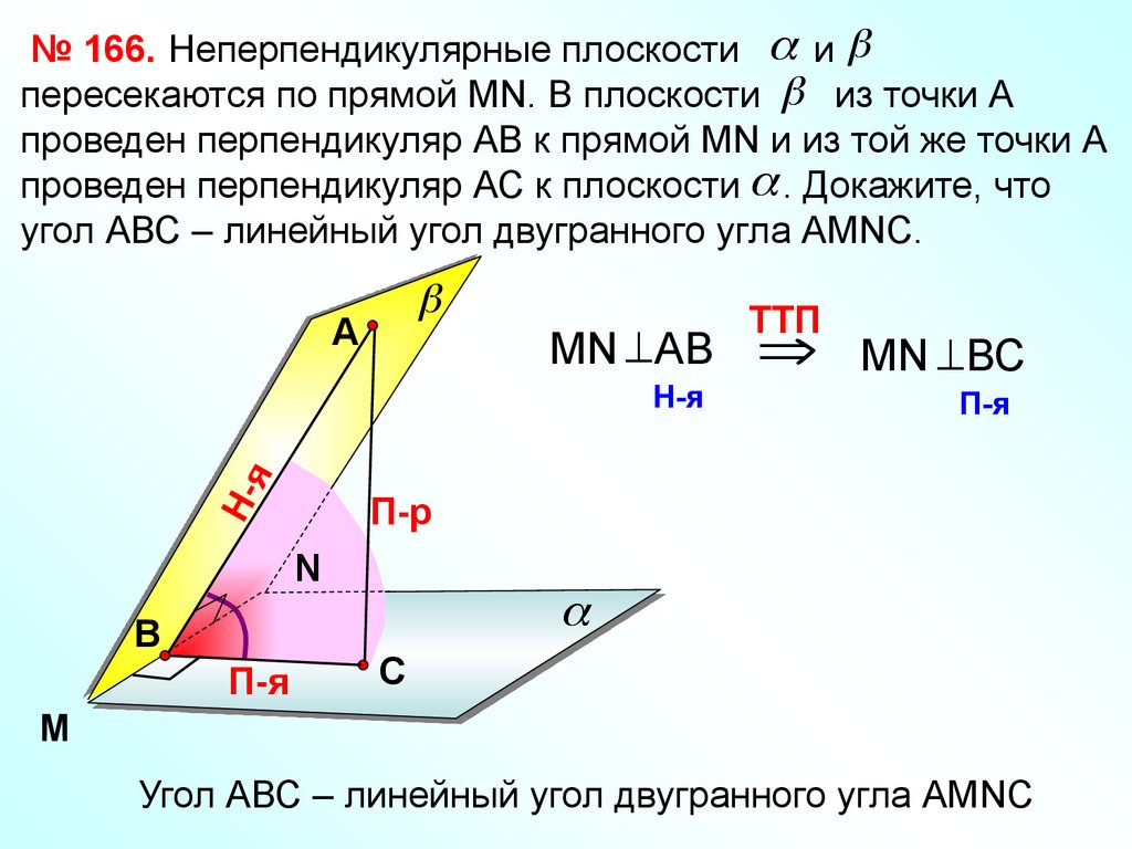 № 166. Неперпендикулярные плоскости ипересекаются по прямой МN. В плоскости из точки А