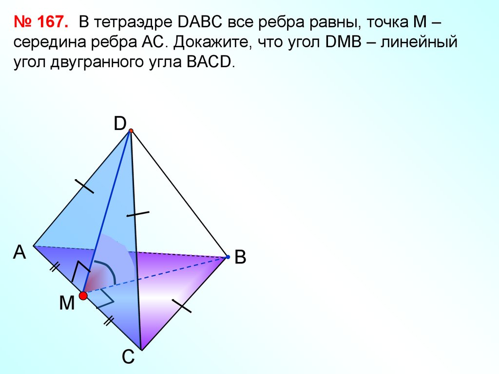 № 167. В тетраэдре DАВС все ребра равны, точка М –середина ребра АС. Докажите, что угол DМВ – линейный