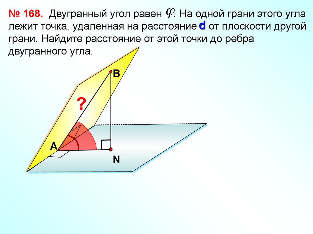№ 168. Двугранный угол равен . На одной грани этого углалежит точка, удаленная на расстояние d