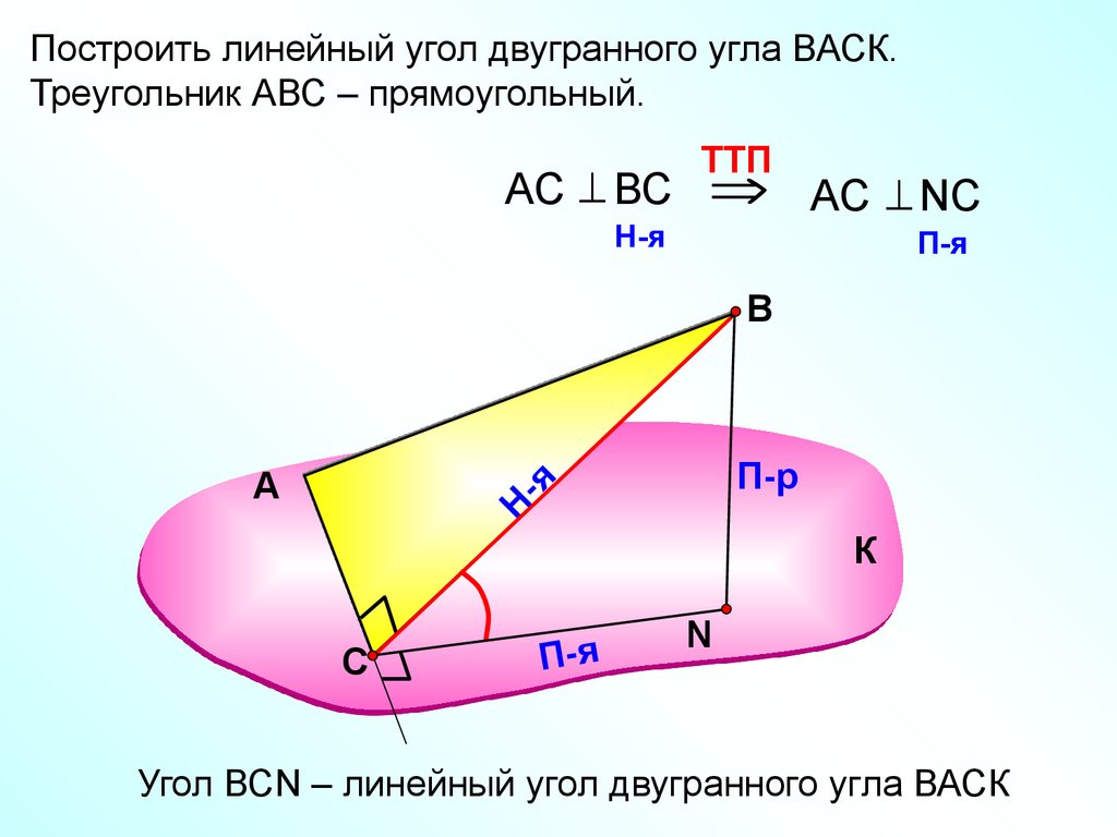 Построить линейный угол двугранного угла ВАСК.Треугольник АВС – прямоугольный.