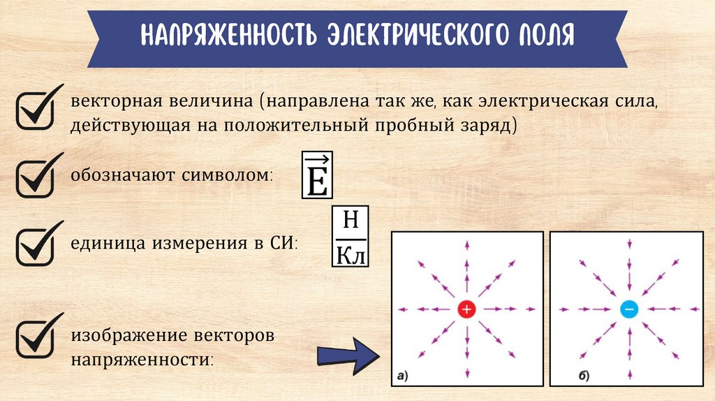 векторная величина (направлена так же, как электрическая сила,действующая на положительный пробный заряд)