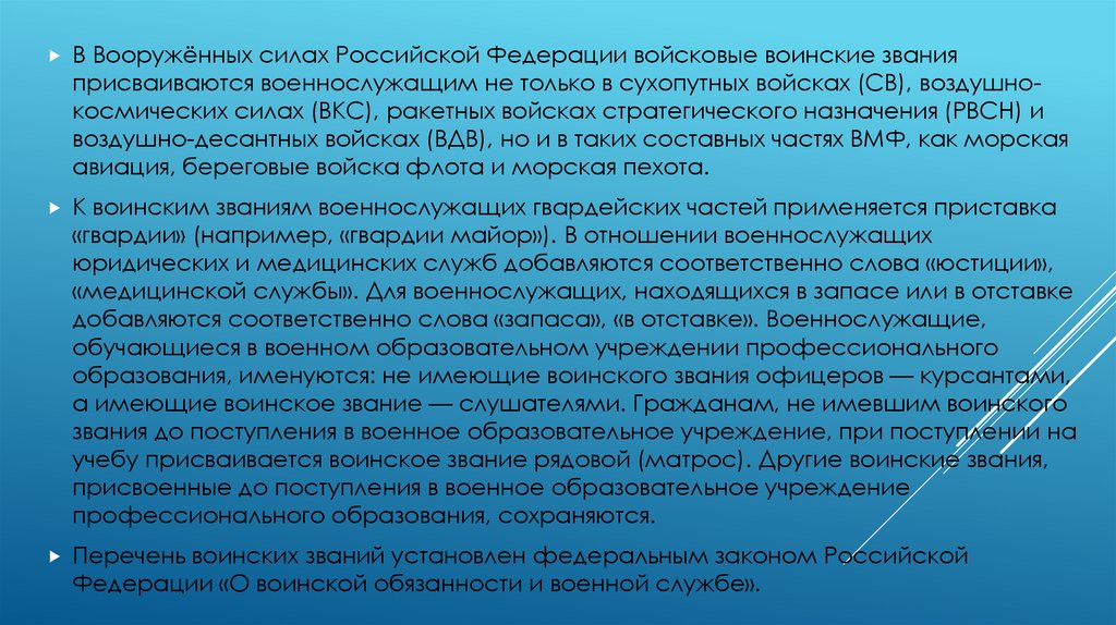 В Вооружённых силах Российской Федерации войсковые воинские званияприсваиваются военнослужащим не только в сухопутных войсках (СВ), воздушнокосмических силах (ВКС), ракетных войсках стратегического назначения (РВСН) и