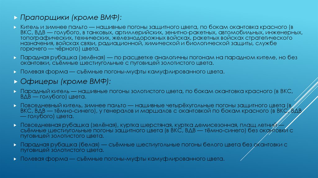 Прапорщики (кроме ВМФ):Китель и зимнее пальто — нашивные погоны защитного цвета, по бокам окантовка красного (в
