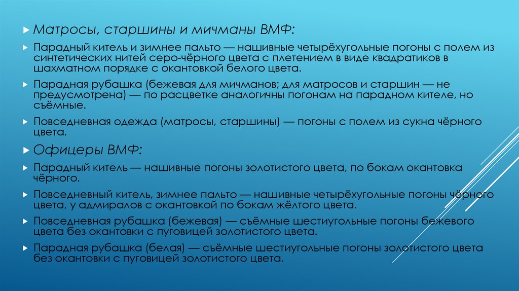 Матросы, старшины и мичманы ВМФ:Парадный китель и зимнее пальто — нашивные четырёхугольные погоны с полем из