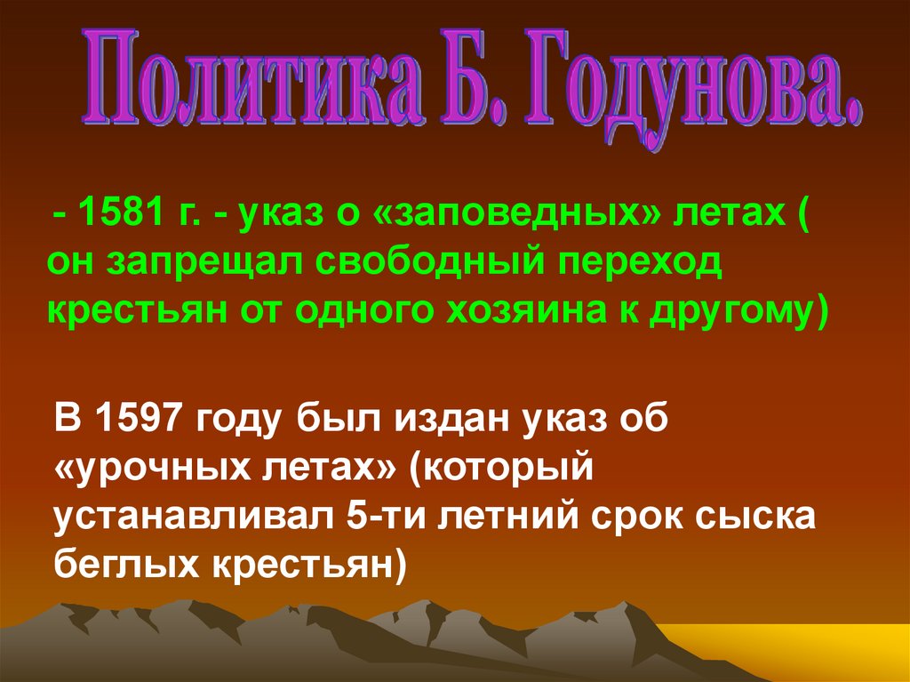 - 1581 г. - указ о «заповедных» летах (он запрещал свободный переход