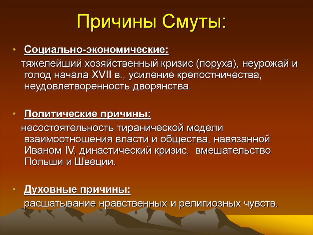 • Социально-экономические:тяжелейший хозяйственный кризис (поруха), неурожай и