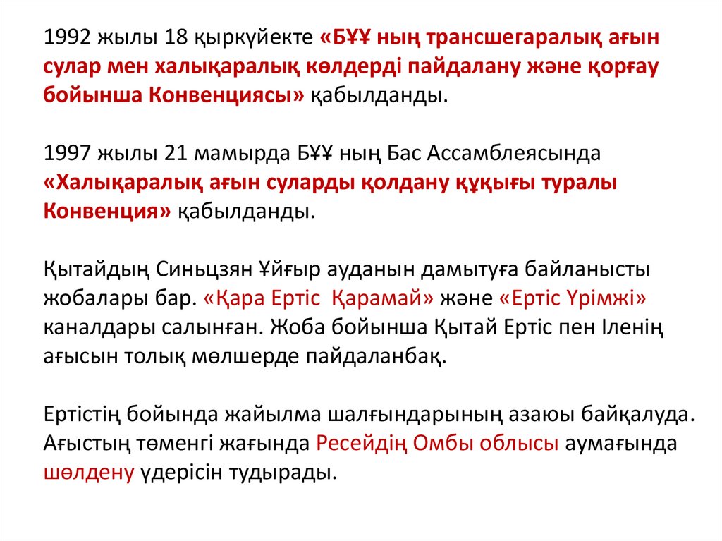 1992 жылы 18 қыркүйекте «БҰҰ ның трансшегаралық ағынсулар мен халықаралық көлдерді пайдалану және қорғау