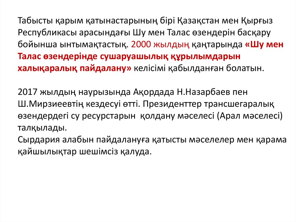 Табысты қарым қатынастарының бірі Қазақстан мен ҚырғызРеспубликасы арасындағы Шу мен Талас өзендерін басқару