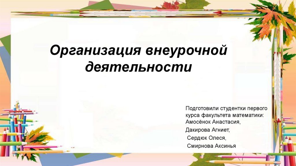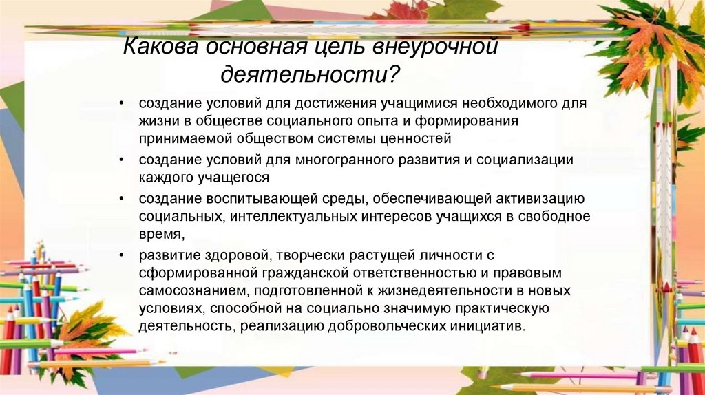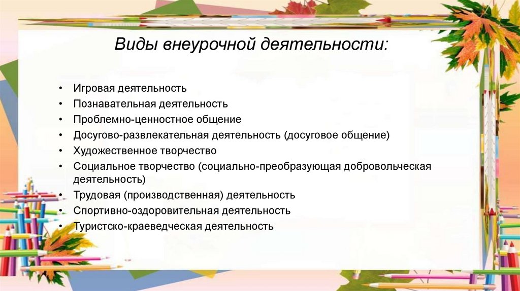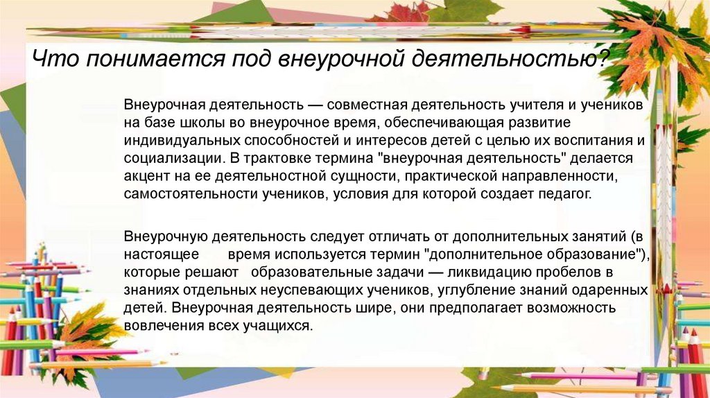 Внеурочная деятельность — совместная деятельность учителя и учениковна базе школы во внеурочное время, обеспечивающая развитие