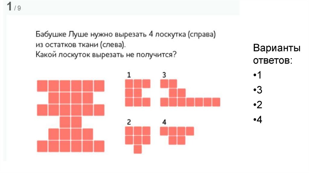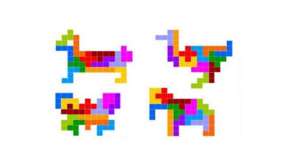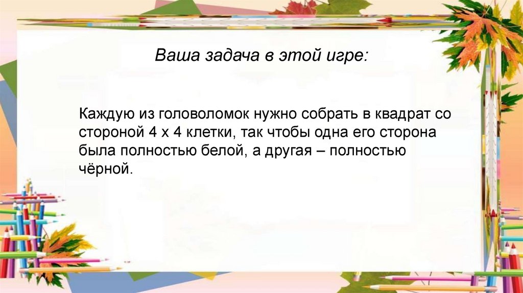 Каждую из головоломок нужно собрать в квадрат состороной 4 х 4 клетки, так чтобы одна его сторона