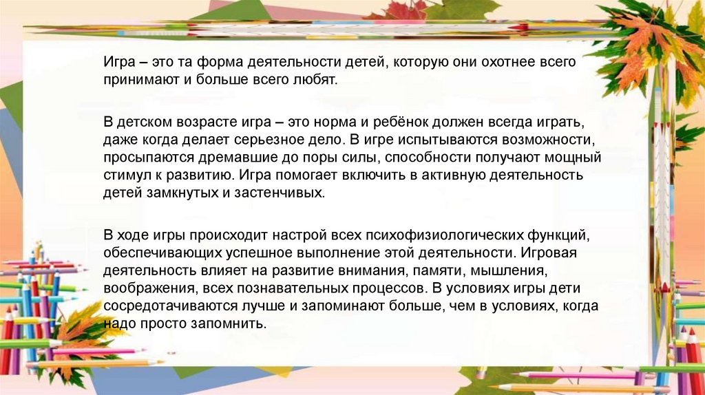 Игра – это та форма деятельности детей, которую они охотнее всегопринимают и больше всего любят.