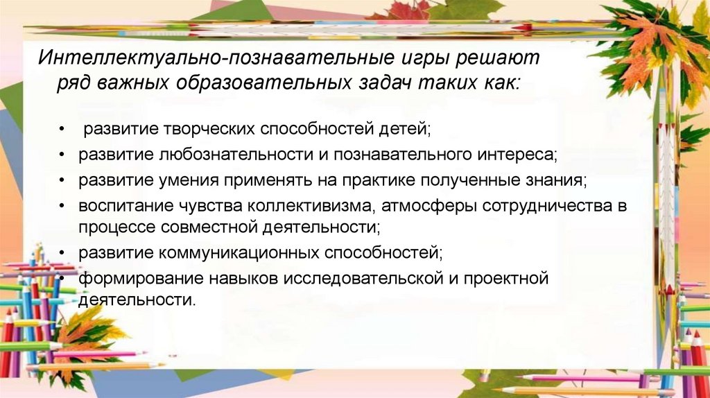 6. Интеллектуально-познавательные игры решают ряд важных образовательных задач таких как:
