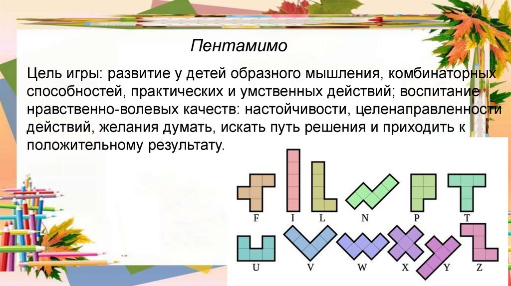 Цель игры: развитие у детей образного мышления, комбинаторныхспособностей, практических и умственных действий; воспитание